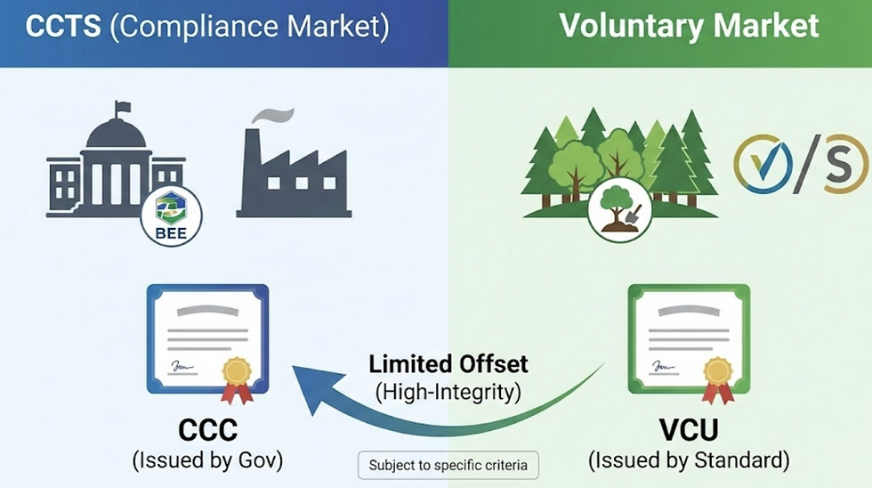 Currently, the "offset mechanism" allows for a limited percentage of voluntary credits to be used for compliance, provided they meet high-integrity criteria (e.g., permanent removal). This fungibility is what links the global VCM (Voluntary Carbon Market) to the Indian compliance market.
